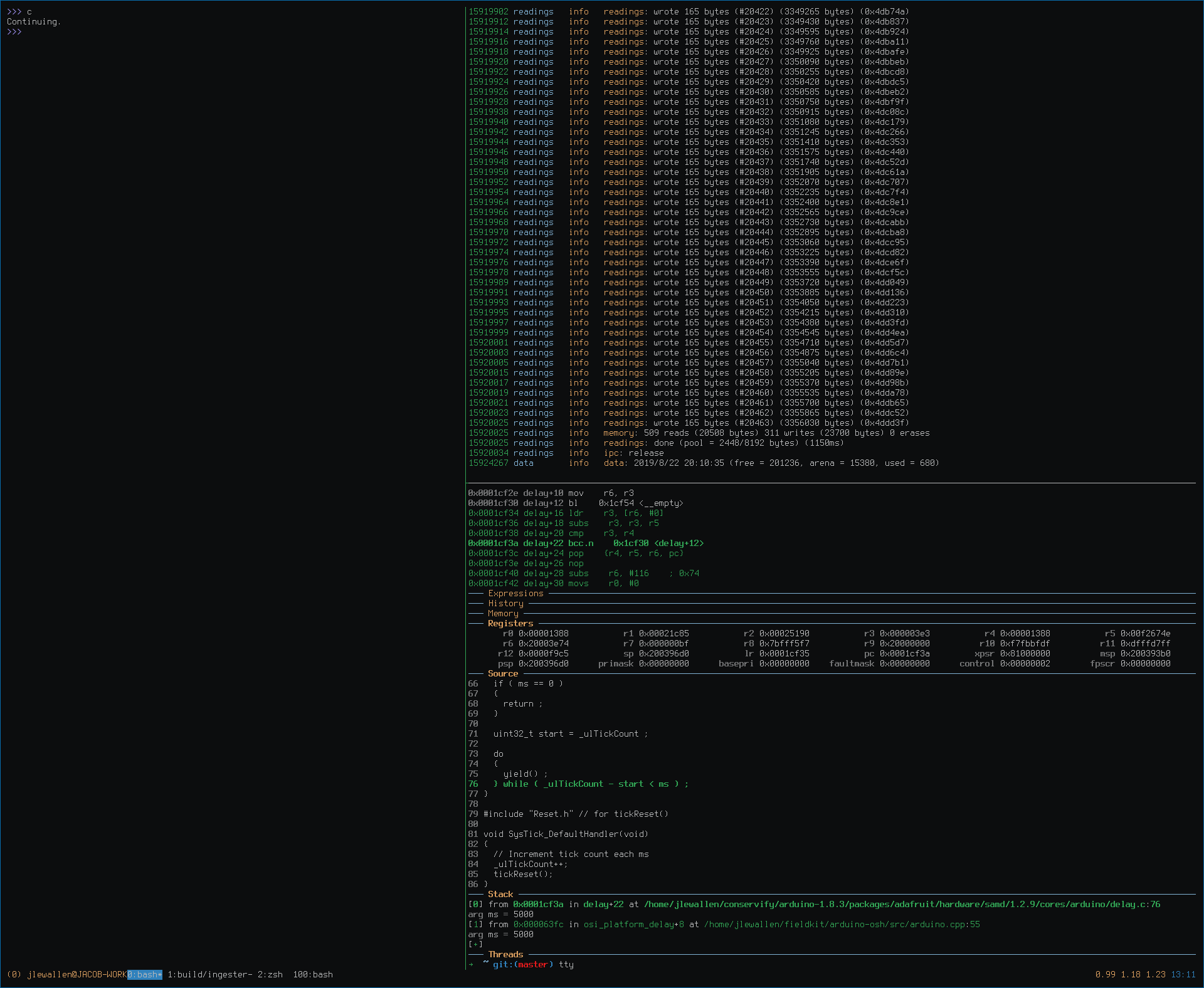1. I exclusively load and run firmware from inside GDB. In fact, I now spend all my waking development time inside GDB. Prior to this development cycle I would rely heavily on uploading new firmware over USB, leaning on that functionality being provided by the standard Arduino bootloader. This was annoying in some cases, especially when dealing with hard faults and other serious bugs.