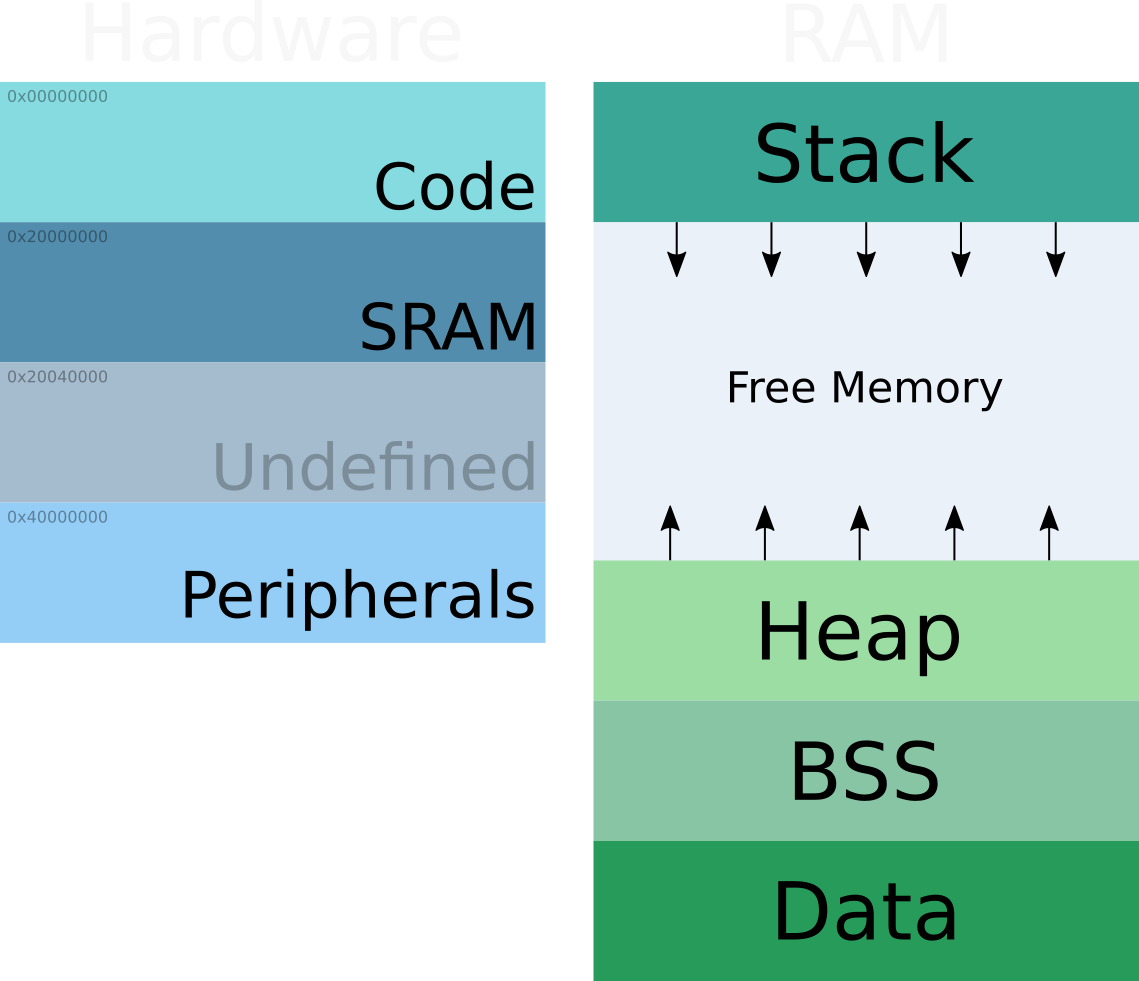 - Peripherals: The physical hardware and how the software interacts with it is mapped to memory in this region. It’s how the hardware makes itself available and is, hopefully, abstracted behind an intuitive software layer. We’ll be talking the least about this region.