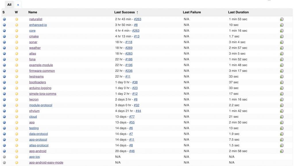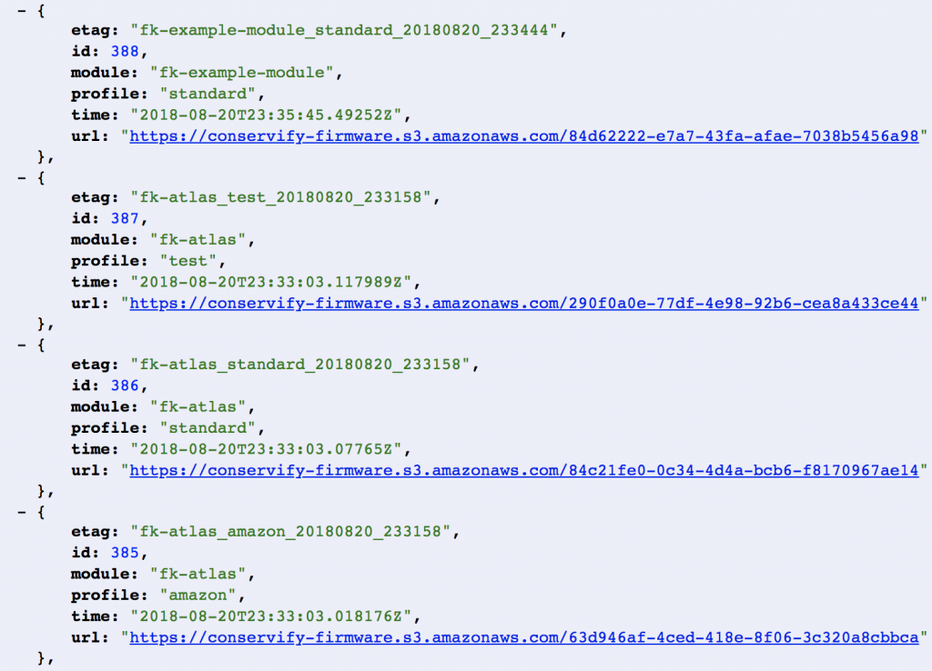 I wanted to briefly mention that we rely heavily on our Jenkins server for managing our builds and some of our workflows. In fact, it’s through this server that new firmware gets fed to the server so they can be distributed to devices. We’re actually planning to write a dedicated post to the way we use Jenkins internally, but for now the basic idea is that after a successful build, the compiled and tested binaries are uploaded to S3 and the metadata for them is recorded in our database. We then have a tool that we can use to associate one of those firmwares with a device so that it’ll be downloaded and flashed on the next checkin.