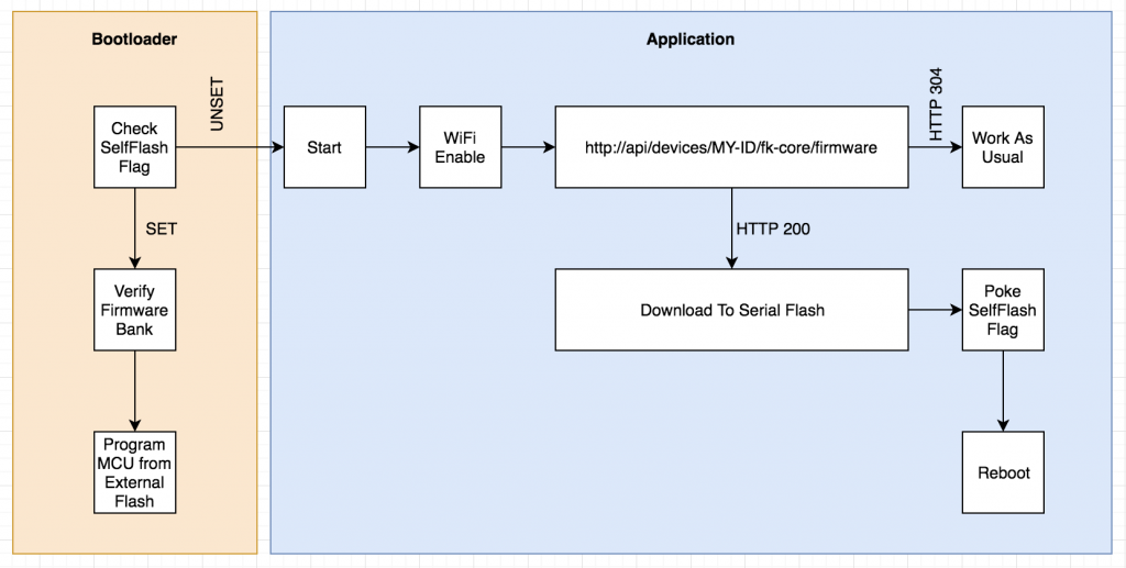 At a high level, the basic premise is that the station would periodically check with our servers to see if there is new firmware available. If there is, the firmware is downloaded and then stored in the Serial Flash chip. Once completed and verified, the MCU sets a flag in memory indicating the self-flash should be done and then restarts itself. At startup our custom bootloader checks for this flag, and if set will reprogram the MCU’s flash memory from the binary in the external flash chip.