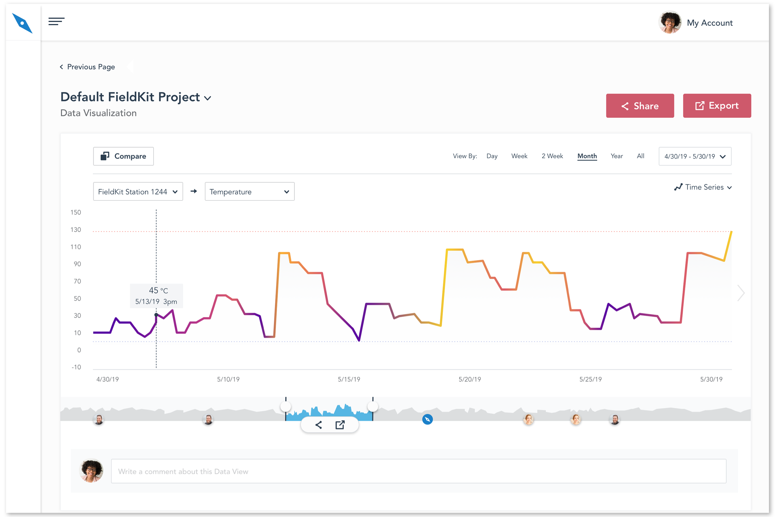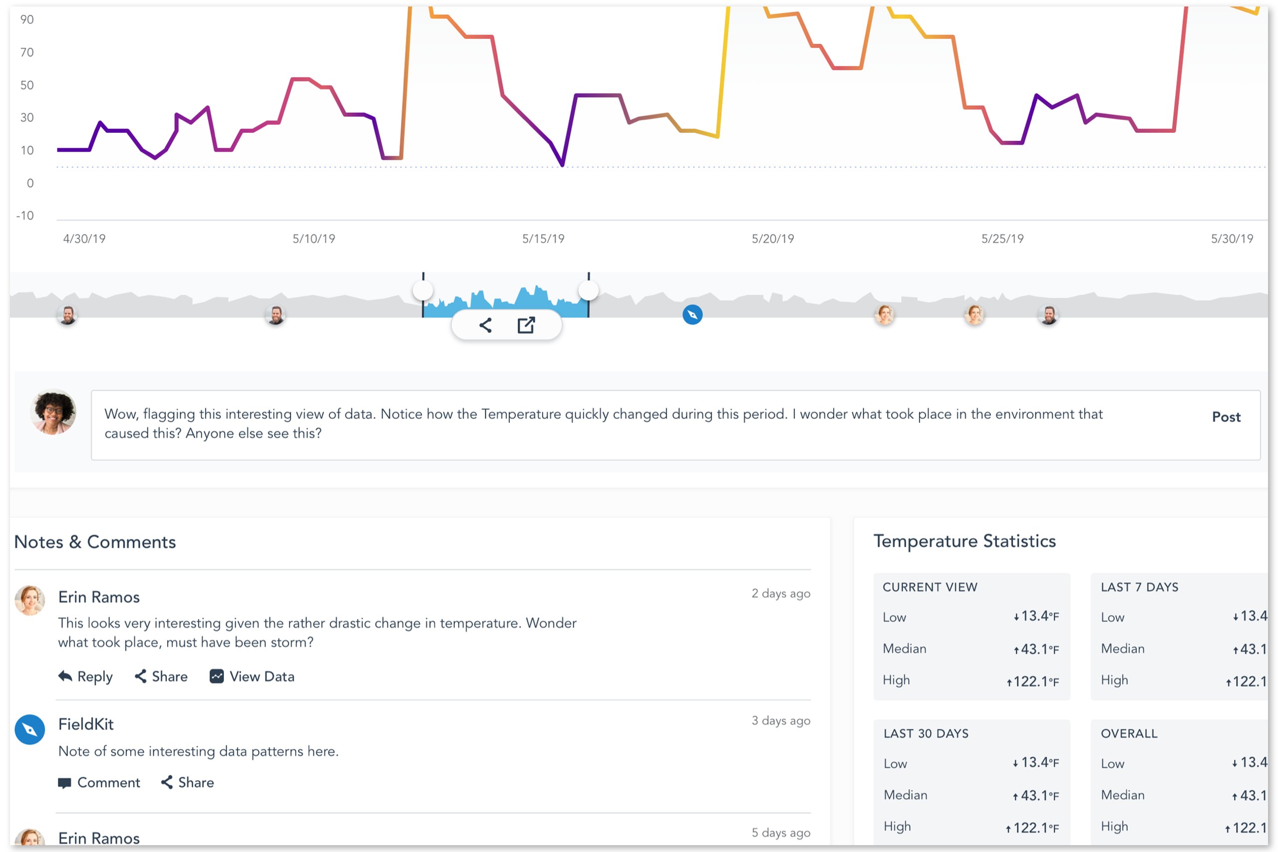 Las funciones de anotación te permiten marcar y compartir vistas de datos interesantes con tu equipo o con la comunidad de FieldKit en general.